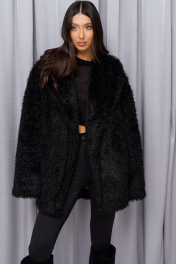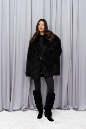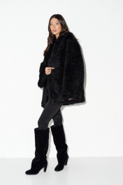 Полупальто прямого кроя, выполнено из фактурного мехового полотна черного цвета. Характеристики: прямой крой, стеганая подкладка на синтипоне, воротник отложной, застёжка центральная крючки, рукав вточной свободного кроя, в боковых швах карманы. Длина по спинке 78 см, длина рукава от края горловины 78см.