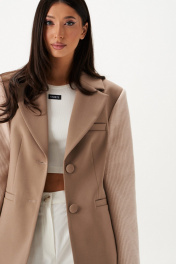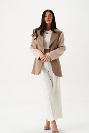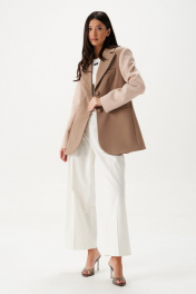 Жакет прилегающего силуэта. Выполнен из пальтовой ткани бежевого цвета в комбинации с пальтовой фактурной тканью. Воротник отложной с лацканами. Рукав втачной. Есть подкладка. По переду вверху имитация карманы с листочкой, внизу функциональные карманы с листочкой. Застёжка центральная петли-пуговицы. Длина спинки 74 см, длина рукава 64 см