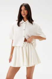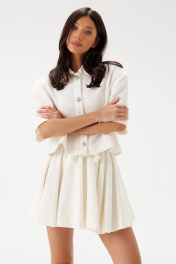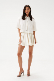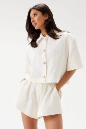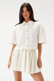 Жакет укороченный прямого кроя выполнен из хлопкового полотна с тиснением молочного цвета. Характеристики: воротник рубашечного типа, застежка центральная на акцентные пуговицы с бусинами, съемные подплечники, короткий рукав. Длина изделия по спинке 49см, длина рукава 26см.