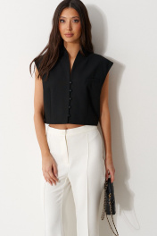 Жилет прямого свободного кроя выполнен из текстильного полотна черного цвета. Характеристики: прямой свободный крой,брендированная подкладка, застежки центральные на петли - пуговицы, декоративный карман. Длина по спинке 41см.
