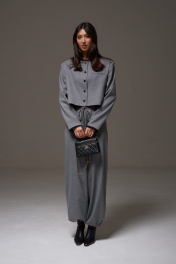 Жакет укороченный прямого свободного кроя. Выполнен из текстильной ткани серого цвета. С подкладкой. Горловина круглая. По переду на уровне груди слева имитация кармана с листочкой с пуговицей. Застёжка центральная - пуговицы. Рукав втачной. Горловина и низ рукава декорированы кружевом. Длина рукава от линии втачивания 63 см. Длина спинки 43 см