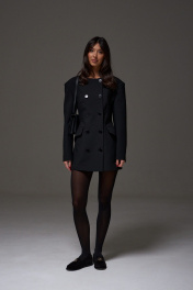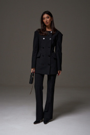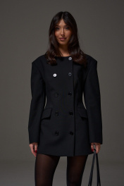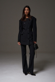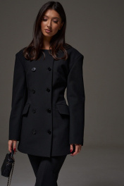 Жакет полуприталенного силуэта выполнен из текстильного полотна черного цвета. Характеристики: полуприталенный силуэт, двубортный, брендированная подкладка, подплечники, овальный вырез горловины, по переду функциональные карманы с клапаном, рукав втачной, по низу рукава нашиты пуговички. Длина по спинке 76, длина рукава 61 см.