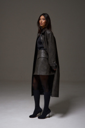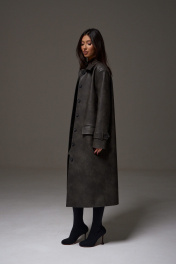 Удлиненный жакет прямого свободного кроя, выполнен из экокожи. Характеристики: отложной воротник, застежка центральная на петли - пуговицы. Брендированная подкладка, подплечники. Рукав втачной, по низу рукава пата с пуговицей. В комплекте идет пояс из основной ткани изделия. По переду карманы с клапаном. В среднем шве спинки шлица 44см. Длина изделия 117 см, длина рукава от края горловины 79.5 см.