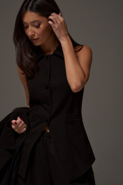 Жилет с открытыми плечами прилегающего силуэта выполнен из костюмной ткани черного цвета. Характеристики: прилегающий силуэт, подкладка, застежка центральная на петли пуговички, отложной воротник, по переду изделия карманы. Длина по спинке 59 см.