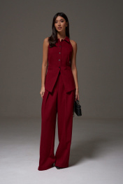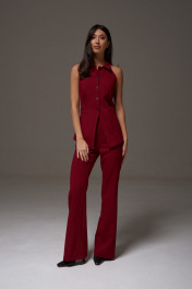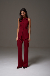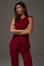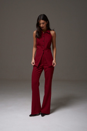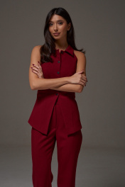 Жилет с открытыми плечами прилегающего силуэта выполнен из костюмной ткани бордового цветв. Характеристики: прилегающий силуэт, подкладка, застежка центральная на петли пуговички, отложной воротник, по переду изделия карманы. Длина по спинке 59 см.