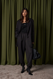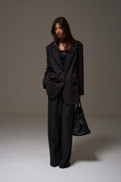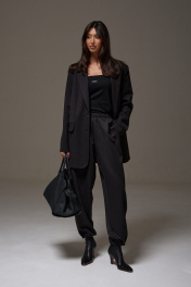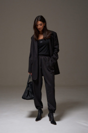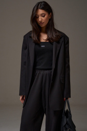 Жакет однобортный прямого свободного кроя, выполнен из текстильного полотна черного цвета. Характеристики: брендированная подкладка, подплечники, воротник с остроугольным лацканом, застежка центральная на петли пуговицы, по переду карманы с клапаном, рукав втачной, спинка со средним швом, по низу изделия лацкан 29см, в комплекте пояс из ткани основного изделия. Длина жакета по спинке 78 см, длина рукав 64см.