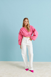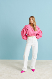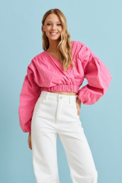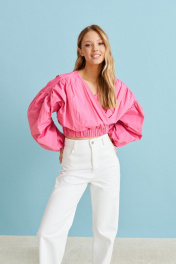 Укороченная блуза с изящными складкам. Блуза позволит Вам создать романтический и женственный образ.Характеристики: укороченная, подкладка, V образный вырез горловины, изящные складки от плеча до низа изделия, рукав объёмный спущен, по низу рукава подгиб на резинке. По низу изделия резинка со сборкой. Длина по спинке 47 см от плеча, длина рукава 68 см от края горловины.