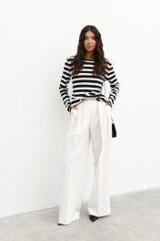 Джемпер выполнен из плотного трикотажного плотна с горизонтальной черно-белой полоской . Характеристики: полуприлегающий силуэт, овальная горловина, рукав втачной. Длина по спинке 57см. Рукав вточной, длина 64см.