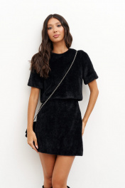 Укороченный топ прямого кроя выполнен из мягкого фактурного полотна черного цвета. Характеристики: прямой крой, подкладка, горловина овальная, рукав втачной, застежка на петлю пуговичку по спинке. Длина по спинке 43 см, длина рукава 25 см.