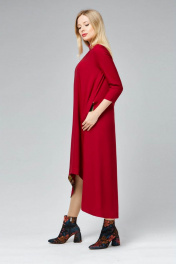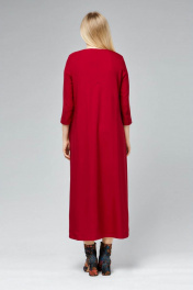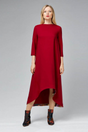 Платье женское силуэта «трапеция» с фигурной линией низа из поливискозной ткани. Линия горловины оформлена в виде «лодочки». Застёжка в среднем шве спинки на тесьму-молнию с металлическим звеном. Спинка с косыми рельефными швами, переходящими на деталь переда. В боковых швах обработаны карманы. Рукав втачной одношовный с локтевой вытачкой. Длина по спинке от верхней точки плечевого шва - 120 см, длина рукава - 43 см.