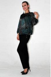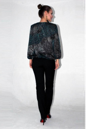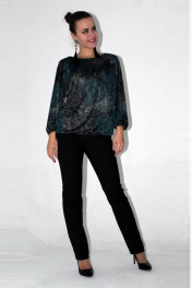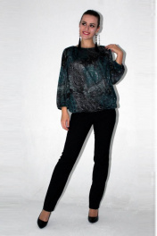 Блузка женская силуэта «овал» длиной выше линии бёдер, с втачным покроем рукава, с горловиной типа «лодочка», низ изделия и низ рукава на резинке. По линии горловины переда четыре складки. Рукав длиной 3/4.