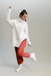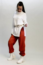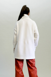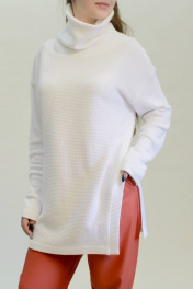 Джемпер женский прямого обьемного силуэта, с высоким и широким воротником-стойкой, длиной ниже линии бедер, со спущенной линией плеча. Рукав длинный, прямой. В левом боковом шве длинный фигурный разрез.