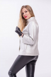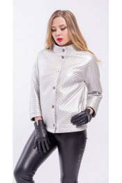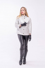 Куртка женская прямого силуэта из стеганой ткани с покрытием «лаке» на подкладке длиной до бедра, с цельновыкроенным рукавом, переходящим в отрезную боковую часть изделия. Застёжка на 6 металлических кнопок. На деталях переда обрабатываются нагрудные вытачки, выходящие из рельефа. В рельефах обработаны карманы. Спинка со средним швом.