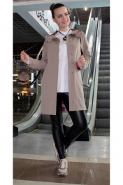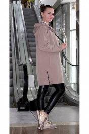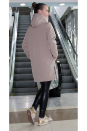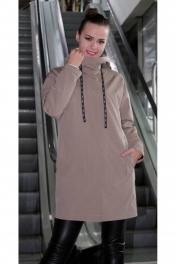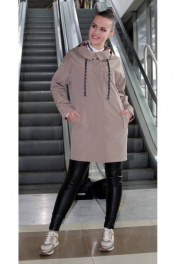 Плащ женский свободного силуэта из плащевой ткани, длиной выше колена, на подкладке, с капюшоном, со спущенной линией плеча, рубашечным покроем рукава и притачной планкой по центру переда. Застёжка на 10 потайных кнопок. На деталях переда ниже талии обработаны накладные карманы сложной формы с вертикальными клапанами и декоративной тесьмой вдоль бокового шва от кармана до низа. Капюшон с цельновыкроенной стойкой, двухшовный и широкой притачной деталью по внешнему контуру. На капюшоне обработаны прорезные петли из которых продета декоративная тесьма. Рукав одношовный. Плащ на декоративной подкладке. Внутренняя часть капюшона выполнена также из декоративной подкладки