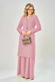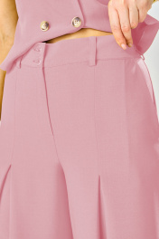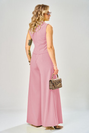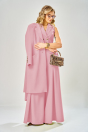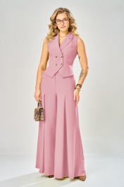 Комплект женский состоит из брюк и жилета, выполнен из текстильной ткани. Жилет женский укороченный с фигурной линией низа, с двубортной застежкой на 4 петли и пуговицы. Перед с рельефами от проймы до низа. Спинка со средним швом, с рельефом от проймы до низа. Воротник пиджачного типа с отложными лацканами. Жилет на подкладке. Брюки-палаццо прямого силуэта, с застежкой на тесьму-молнию, с гульфиком и откоском в среднем шве. Пояс притачной, застегивающихся на две прорезные петли и пуговицы, с 5 обработанными шлевками под ремень. По задней части в пояс вставлена эластичная тесьма. Задние половинки брюк с двумя таллиевыми выточками. Передние половинки брюк с бантовой складкой, застроченной на 10см, выходящей от шва притачивания пояса, и боковыми косыми карманами. Длина жилета по спинке р.46-50 - 50 см, рр.52,54 – 53 см. Длина брюк 115 см.