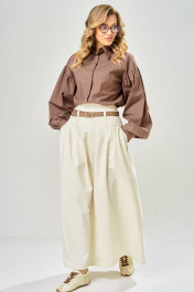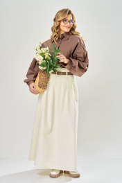 Комплект женский состоящий из блузки и юбки, выполнен из текстильной ткани. Шоколадная рубашка из хлопка с акцентными рукавами — это воплощение эстетики «тихой роскоши». Глубокий цвет в сочетании с объемом выглядит дорого и стильно. Джинсовая светлая юбка макси из хлопка — это база с характером. В отличие от смесовых тканей, чистый хлопок держит форму, выглядит дорого и со временем красиво «старится». Блуза прямого силуэта, с центральной застежкой на 6 прорезных петель и пуговиц, низ фигурной формы. Спинка без декоративных элементов. Рукава длинные рубашечного типа по шву притачивания обработана сборка, с притачными по низу манжетами, застегивающимися на 1 прорезную петлю и пуговицу. По шву притачивания манжет обработаны разрез и сборка. Воротник стояче-отложной, с отрезной стойкой. Юбка женская длиной макси А-силуэта, с застежкой на потайную тесьму-молнию в левом боковом шве. Юбка без подкладки. Перед и зад с кокеткой, от шва обработаны односторонние складки. Кокетки со шлевками. По переднему полотнищу обработаны боковые карманы со скосом.