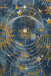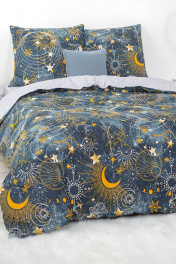 Комплект постельного белья (поплин). Пододеяльник 1 шт: длина 215 см, ширина 175 см Простыня 1 шт: длина 215 см, ширина 200 см Наволочки 2 шт: 70*70 см Особенности отделки: пододеяльник с карманом, наволочки с клапаном Как чарующа и необыкновенна «Живая музыка»! Постельное белье с космосом из поплина будто погружает в сновидения. Можно долго любоваться каждой деталью, изображенной на звездном дизайне. Композиция отражает загадочную Вселенную с планетами, космическими туманностями, окружающими звезды, и золотистым месяцем в центре. Стильный и модный комплект отражает тренды этого сезона и дарит настроение мечтательности.