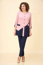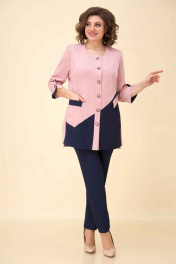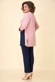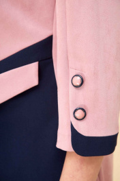 Костюм женский полуприлегающего силуэта из замша на трикотажной основе и брючной ткани. Кардиган с центральной застежкой по переду на планку, на петли и пуговицы. По переду бочки, ассиметричный подрез с карманом и клапаном. Спинка без вытачек. Рукав три четверти по передней части фигурный подрез на пуговицы. Брюки со стрелками, зауженные к низу. Застежка гульфик на тесьму-монию, по поясу на петлю и пуговицу. Пояс с резинкой сзади. Вырез горловины: округлый Силуэт: полуприлегающий Длина изделия кардиган: 76 (±1) см. Длина изделия брюки: 100 (±2) см. Рукав: 3/4 Длина рукава: 48 (±1) см. Статус модели: повседневный Вид застёжки кардиган: по переду на пуговицы Вид застёжки брюки: гульфик на молнию Цвет кардиган: лотос, синий Цвет брюки: синий Объем груди: Размер 52 – 118 (±2) см. Размер 54 – 122 (±2) см. Размер 56 – 126 (±2) см Объем талии кардиган: Размер 52 – 110 (±2) см. Размер 54 – 114 (±2) см. Размер 56 – 118 (±2) см. Объем талии брюки: Размер 52 – 81 (±2) см. Размер 54 – 85 (±2) см. Размер 56 – 89 (±2) см. Объем бедер кардиган: Размер 52 – 120 (±2) см. Размер 54 – 124 (±2) см. Размер 56 – 128 (±2) см. Объем бедер брюки: Размер 52 – 108 (±2) см. Размер 54 – 112 (±2) см. Размер 56 – 116 (±2) см. Ширина рукава под проймой: Размер 52 – 19 (±1) см. Размер 54 – 20 (±1) см. Размер 56 – 21 (±1) см. Ширина спинки: 40,5 (±0,5) см