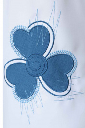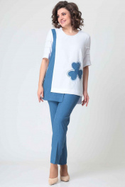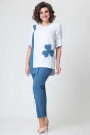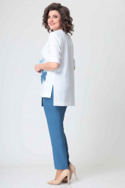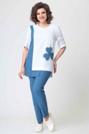 Костюм женский полуприлегающего силуэта из костюмной ткани. Блузка двухцветная, с вышивкой на переднем полотнище. Горловина круглая. Рукав 3/4 с защипами. Перед с ассиметричным подрезом. Спинка с каплевидным разрезом на пуговицу. В боковых швах разрезы. Брюки на поясе со шлевками, Застежка гульфик на молнию. Брюки джинсового кроя, зауженные к низу. Вырез горловины: круглый Длина изделия блузка: 75 (±1) см. Длина изделия брюки: 97 (±2) см. Рукав: 3/4 Длина рукава: 31 (±1) см. Статус модели: нарядно-повседневный Силуэт: полуприлегающий Вид застёжки блузка: каплевидный разрез на пуговицу по спинке Вид застёжки брюки: гульфик на молнию Цвет блузка: деним, белый Цвет брюки: деним Объем груди: размер 52 – 110 (±2) см. размер 54 – 114 (±2) см. размер 56 – 118 (±2) см Объем талии блузка: размер 52 – 104 (±2) см размер 54 – 108 (±2) см. размер 56 – 112 (±2) см Объем талии брюки: размер 52 – 94 (±2) см. размер 54 – 98 (±2) см. размер 56 – 102 (±2) см Объем бедер брюки: размер 52 – 110 (±2) см. размер 54 – 114 (±2) см. размер 56 – 118 (±2) см Ширина рукава под проймой: размер 52 – 18,5 (±1) см. размер 54 – 19,5 (±1) см. размер 56 – 20,5 (±1) см. Ширина спинки: 41 (±0,5) см.