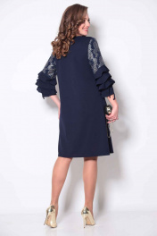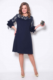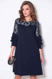 Платье женское нарядное свободного силуэта, из трикотажного крепового полотна и гипюра. Рукав три четверти, горловина круглая. По низу рукава каскад воланов и бантик из рулика. Перед без вытачек. Спинка с талиевыми вытачками. Перед по низу несколько короче спинки. Платье без застёжки. Вырез горловины: округлый Длина изделия: 96 (±2) см. Силуэт: А – образный Рукав: 3/4 Длина рукава: 45 (±1) см Статус модели: нарядный Цвет: синий Объем груди: размер 48 – 102 (±2) см. размер 50 – 106 (±2) см. размер 52 – 110 (±2) см. Объем талии: размер 48 – 98 (±2) см. размер 50 – 102(±2) см. размер 52 – 106 (±2) см. Ширина рукава под проймой: размер 48 – 16,5 (±1) см. размер 50 – 17,5 (±1) см. размер 52 – 18,5 (±1) см. Ширина спинки: 38 (±0,5) см.