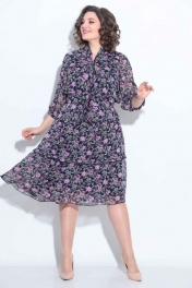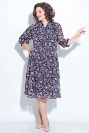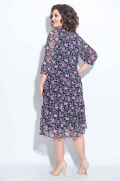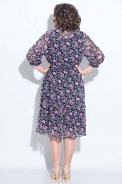 Платье женское, нарядно- повседневное, свободного силуэта, выполнено из шифона. Горловина на стойке, переходящей в бант. Рукав покроя реглан, расширен к низу на сборку с резинкой. По переду и спинке платье имеет подрез для двух ярусов воланов. Во второй ярус вставлена рюша. Воланы присборены. К платью прилагается пояс с резинкой, застегивающийся сзади на спинке. Платье на подкладке из трикотажной ткани. Подкладка не прикреплена к изделию. Может использоваться по желанию под любые другие изделия клиента. Вырез горловины: стойка с бантом Длина изделия: 114 (±1) см. Силуэт: свободный Рукав: 3/4 Длина рукава: 60 (±1) см Статус модели: нарядно-повседневный Цвет: синий Рисунок: цветочный принт Объем груди: размер 52 – 114 (±2) см. размер 54 – 118 (±2) см. размер 56 – 122 (±2) см. Объем талии: размер 52 – 114 (±2) см. размер 54 – 116 (±2) см. размер 56 – 120 (±2) см. Ширина рукава под проймой: размер 52 – 22 (±1) см. размер 54 – 24 (±1) см. размер 56 – 26(±1) см.