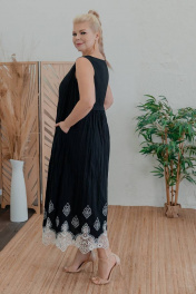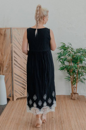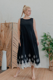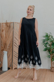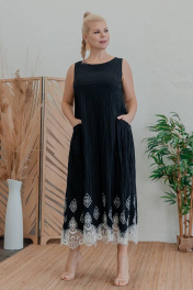 Длина изделия по спинке: 130 см Платье расширенного силуэта без рукава с горловиной «лодочка» из текстильного хлопка с бордюрной вышивкой. По переду диагональные карманы в шве с листочкой. По спинке полурельефы, по центральной части декоративная складка и сборка.