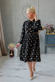 Платье А-образного силуэта с длинным рукавом. По горловине воротник стойка переходящий в бант. По переду и спинке горизонтальные подрезы.