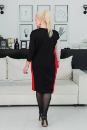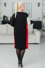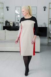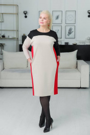 платье комбинированное зауженного силуэта с длинным рукавом. Горловина округлая. По переду и спинке вертикальный рельеф. По переду горизонтальная кокетка с декоративной пришивной металлической пластинкой. Карманы в боковых швах. Застежка на потайную тесьму молнию в среднем шве спинки.