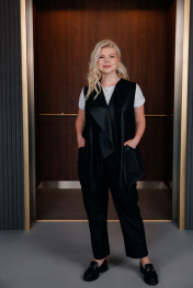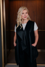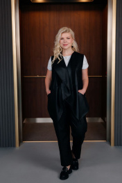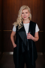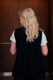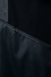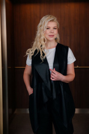 Жилет комбинированный (трикотажный нейлон + эко-кожа) силуэта трапеция с ассиметричным передом. По переду диагональные рельефы с карманами с потайными молниями. Длина изделия по спинке: 75 см