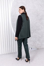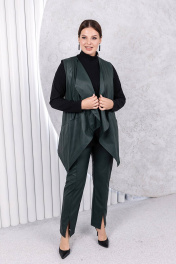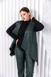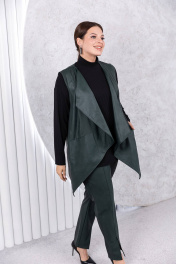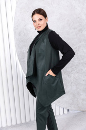 Длина изделия по спинке: 75 см Жилет комбинированный (трикотажный нейлон + эко-кожа) силуэта трапеция с ассиметричным передом. По переду диагональные рельефы с карманами с потайными молниями. !!! комплектуется с брюками 2640