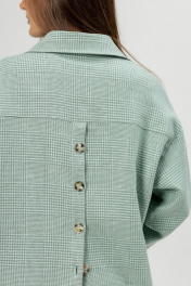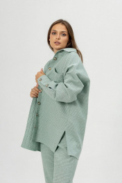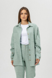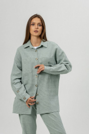 Рубашка выпонена из костюмного теплого льна. Рубашка свободная прямая,со спущенным плечом и длинным рукавом с манжетой. Застежка центральная на петли ипуговицы.Воротник рубашечный.По переду карманы. По спинке слелана глубокая шлица на пуговицах.
