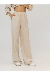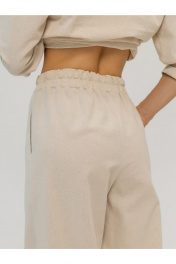 Брюки выполнены из умягченного льна,который прошел энзимную обработку,поэтому изделие не дает усадку после стирки, не колется и не создает неприятных ощущений в носке . Брюки палаццо,немного расширены к низу,с высокой посадкой. По талии на резинке,в боковых швах карманы.