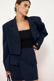 Комплект состоит из жакет и юбки в костюмно-плательной ткани. Жакет укороченный, полуприлегающего силуэта, линия плеча слегка расширена, на подплечниках. Жакет с лацканами, застежкой на пуговицу, рукав втачной, по низу на одном рукаве декоративная нашивка. Жакет на подкладке. Юбка в длине мини, прямого силуэта, с имитацией на запах. По переду не функциональные карманы с клапаном. По спинке потайная молния. Юбка на подкладке. Длина жакет по спинке 44 см. Длина юбки 41 см