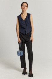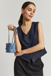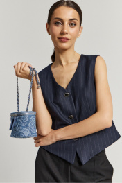 Жилет полуприлегающего силуэта выполнен из фактурной ткани глубокого синего цвета. Жилет на подкладке, застежка центральная на акцентные петли пуговицы, по переду прорезные не функциональные карманы, низ изделия по переду с фигурным срезом.