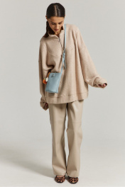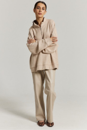 Бежевый джемпер выполнен из мягкого плотного трикотажа, что обеспечивает тепло и комфорт. Горловина стойка с молнией. Рукав спущенный.