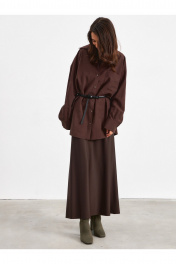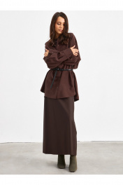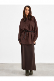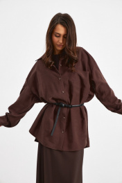 Рубашка в глубоком темно-коричневом цвете. Прямого свободного силуэта. По переду застежка на пуговицы, воротник классический, рукав спущенный на манжете с пуговицей. По переду боковой карман по верху изделия. По бокам рубашки разрезы. В комплекте пояс.