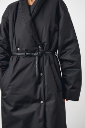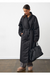 Пальто в черном цвете. Пальто двубортное, с застежкой на кнопки. Рукав спущенный. Пальто на синтепоне. В комплекте съемный пояс.