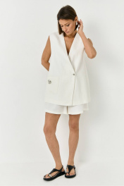 Комплект двойка из льна. Комплект состоит из жилетки и шорт. Жилетка двубортная, функциональный карман с декоративным элементом. Шорты на резинке, по бокам функциональные карманы.
