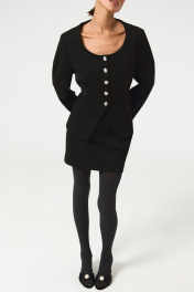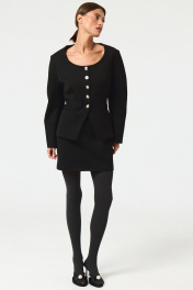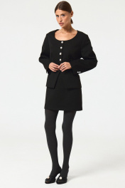 Комплект женский, жакет с юбкой, из костюмной ткани. Жакет без воротника, на притачной подкладке. Полочка с нагрудной вытачкой и рельефом. На полочках два прорезных кармана в рамку. Горловина обработана подбортом и подкладкой по спинке. Спинка со шлицей в среднем шве и рельефами. Рукав трехшовный, втачной в закрытую пройму. В локтевом шве рукава шлица на три петли с глазком и три пуговицы. На подкладке спинки заложена складка. Юбка в длине мини, прямого силуэта на поясе. Застежка-молния