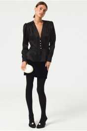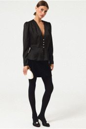 Блузка прилегающего силуэта. По переду отрезная кокетка. По верхнему краю детали переда выполнена сборка. Вырез горловины глубокий, V-образной формы. Застежка центральная. Рукав длинный, втачной, зауженный книзу, со складками по окату. По линии талии притачная двойная баска. Длина блузки выше линии бедер.