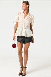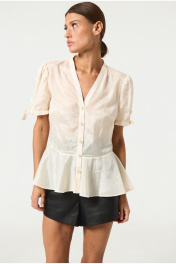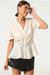 Женская блузка прилегающего силуэта, с центральной застежкой, с баской и коротким рукавом. Перед с нагрудными вытачками из бокового шва. Спинка без среднего шва, с талиевыми вытачками. Рукава длиной до середины плеча, со сборкой по окату, с притачной манжетой. Застежка по притачной планке борта на пуговицы.