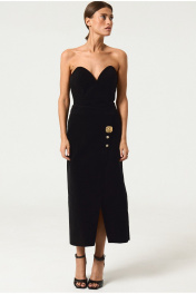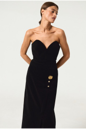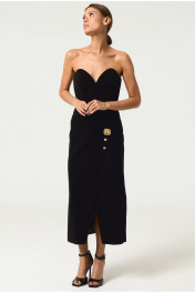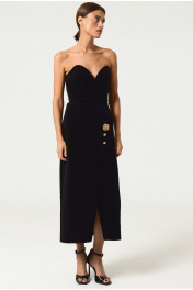 Юбка из ткани с эффектом бархата, в черном цвете. По левой стороне юбки разрез, юбка на запах, декорирована тремя декоративными пуговицами. Юбка на поясе. В запахе изделия пзастежка на молнию.
