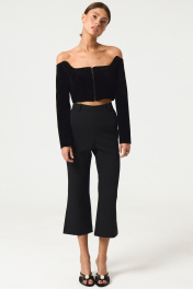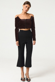 Брюки прямого силуэта, на поясе, из костюмной ткани, высокая посадка, брюки укороченные с разрезами по низу изделия. Застежка на потайную молнию в боковом шве