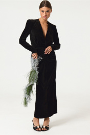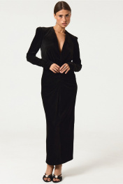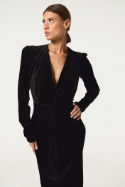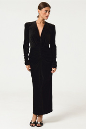 Платье прилегающего силуэта, на притачной подкладке. По переду платье состоит из двух частей. На верхней части драпировка по линии талии. Нижняя часть переда со средним швом и драпировкой от линии талии до линии бедер. Вырез V-образный. Рукав втачной.