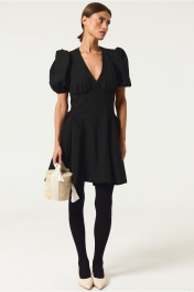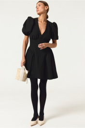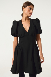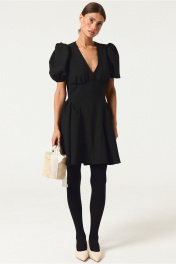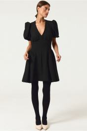 Платье приталенного силуэта с расширенной юбкой книзу. По переду и спинке платья вытачки. В среднем шве спинки застежка на потайную молнию. По переду платье отрезное под линии груди.По среднему шву переда декоративные пуговицы. Вырез горловины V-образный. Воротник отложной