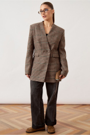 Жакет женский, полуприлегающего силуэта, выполнен из костюмной ткани в мелкую клетку. Модель с углубленным V-образным вырезом горловины, без воротника и лацканов. Застежка смещенная (двубортная) на две пары пуговиц. Перед с талиевыми вытачками и прорезными карманами с клапанами, расположенными горизонтально. Рукав втачной, двухшовный, классической длины. Спинка со средним швом и рельефами от проймы до низа. Изделие на притачной подкладке, линия плеча подчеркнута плечевыми накладками.