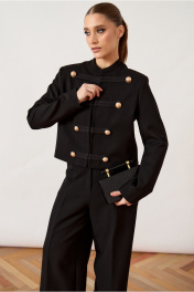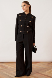 Жилет женский, прямого силуэта, выполнен из плотной костюмной ткани. Модель с воротником-стойкой и глубоким асимметричным запахом на правую сторону. Главной декоративной особенностью изделия являются две пары функциональных завязок из основной ткани, расположенных по правому борту, которые фиксируются на мягкие банты. Перед и спинка с талиевыми вытачками для обеспечения легкого прилегания. Линия плеча укорочена, пройма обработана обтачкой вчистую. Спинка со средним швом. Изделие на подкладке.