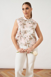 Жилет женский, прилегающего силуэта, выполнен из плотной ткани. Модель с глубоким фигурным вырезом горловины в форме «сердца» (бюстье), без бретелей. Перед и спинка оформлены вертикальными рельефами, в которые вставлены корсетные косточки для создания жесткой формы и подчеркивания талии. Нижний край изделия фигурный, с небольшим удлинением по центру переда. Застежка на потайную тесьму-молнию расположена в среднем шве спинки. Изделие на подкладке, верхний срез обработан обтачкой.