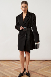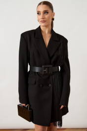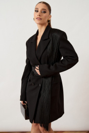 Платье-жакет женское, прямого силуэта, выполнено из плотной костюмной ткани черного цвета. Модель с классическим воротником пиджачного типа и острыми лацканами. Застежка двубортная. Декоративной особенностью изделия является бахрома, втачанная в левый плечевой шов. Перед с горизонтальными прорезными карманами с клапанами. Рукав втачной, двухшовный. Изделие на притачной подкладке.