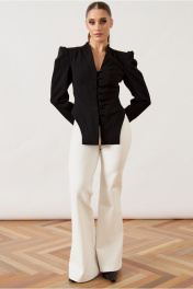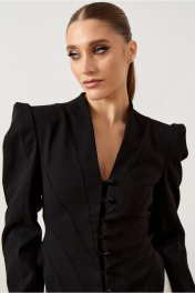 Жакет приталенного силуэта из плотной костюмной ткани черного цвета, на притачной подкладке. Модель с глубоким V-образным вырезом горловины и небольшим воротником-стойкой по спинке. Центральная застежка на пять навесных петель и декоративные пуговицы. Полочка сложного кроя с веерными рельефами, формирующими акцент на талии, и высокими разрезами по боковым швам. Плечевой пояс подчеркнут втачными длинными рукавами с объемной сборкой и высокой головкой.